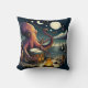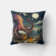 Een octopus speelt energiek een trommel in de buurt van een kampvuur op het strand, onder een sterrenhemel met schepen die in de verte varen.