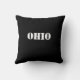 Een charmante kussen met de staatsnaam Ohio en enkele steden in zwarte tekst van verschillende lettertypen en grootten op een rode achtergrond. De achterkant is stevig zwart met het woord "OHIO" in wit. Draai gewoon de kussen om de blik van je kamer snel te veranderen.