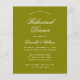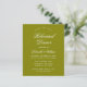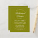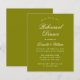 Een simpele uitnodiging voor een repetitief diner met een moderne kleur: olijfgroen. Het heeft slechts een witte tekst op de olijfgroene achtergrond. De woorden "Dinner van de repetitie"en de naam worden geschreven in een elegant kalligrafisch manuscript.