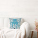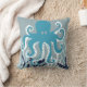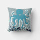 Octopus zwemt tussen zeewier en koraal in tinten blauw met een witte achtergrond.