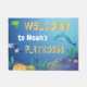 Welkom mat voor kinderspeelkamer met zeeen wezens onder het ontwerp van de zee oceaan. Bewerk de naam. Het kleurrijke afbeelding show een onderwaterscène met een zee schildpad, dolfijn, octopus en verschillende vissen en koralen. Geweldig voor kleine oceaanliefhebbers!