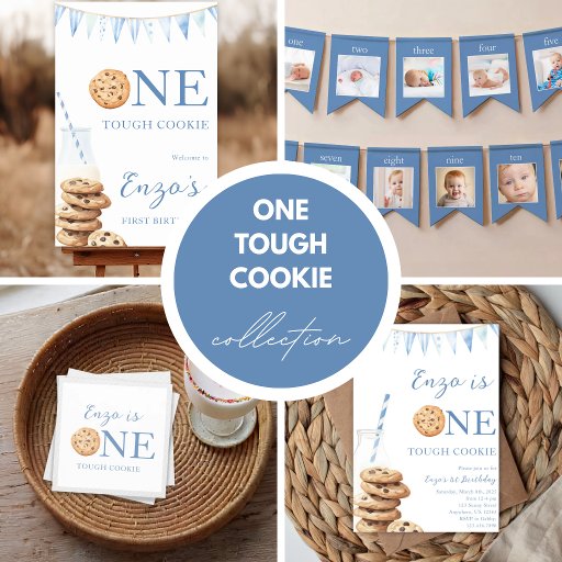 Celebrate your little one’s special day with this playful “One Tough Cookie” birthday invitation! Featuring a baby blue design with cookies and milk, it’s perfect for a fun and sweet first birthday or milestone celebration. Fully customizable with name, age, and party details.