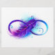 Het oneindige symbool met een mooie veer geschilderd in paarse en blauwe heldere kleuren op witte achtergrond.