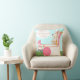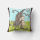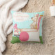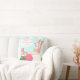 Kunst van kunstenaar Kristie Hubler op kussen - aan de ene kant is bunny aan het ontspannen tegen een krullende boom, en aan de andere kant is de paasbunny aan het ontspannen in een bunny- en eierspoel, met zijn roze bunny slippers op zijn voeten, met de gedachte: "Wow! Ik ben blij dat mijn werk klaar is!"