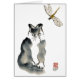 Kitten speelt in de tuin door de watervoorziening wanneer in zoomen een libellen - een onaangenaam insect. Sumi-e, Zen-inkt schilderij van Ellen Miffitt o.a. Nine Lives Studio