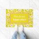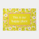 Het heldere en zonnige terugwerppatroon is voorzien van witte bloemen met roze en groene centers op gele achtergrond. Het geel de tekstvakje van het centrum met klantgerichte "Dit is onze gelukkige plaats" tekst