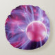 Net als in de 80. 16-inch ronde kussen met een afbeelding van kleurrijk licht dat uitstraalt van een oog op het wereldbol van het Storm. Paarse rug.