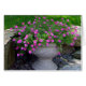 Roze petunia's verspreiden zich over de zijkanten van een decoratieve planter. Met bijbehorende stempels.