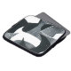 Een zeer kenmerkende laptophoes in een zwart, grijs en wit 'blades'-patroon, van een schermafgedrukt ontwerp van Judy Adamson.