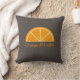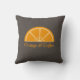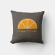 Een bruin kussen met een oranje halve plak en aanpasbare tekst eronder. Het kan worden gebruikt wanneer voor uw huisdecoratie of als een geschenk aan een citrusliefhebber!