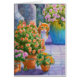 Een oranje kat die uit achter potten bloemen op een patio spiekt. Bezoek Cat-Paintings.com voor meer gemberkattenwaterverven.