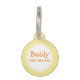 Een afbeelding van een cartoon die het uiterlijk nabootst van een vers gesneden heerlijk oranje vrucht. De achtergrondkleur is lichtgeel. Aan de andere kant zijn er personalizable tekstgebieden voor de naam van het gezelschapsdier en voor een telefoonaantal.