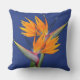Tropische bloemen gooien kussen met oranje paradijsvogelbloemen aan beide zijden. Marineblauwe kleur met twee bloemen aan elke kant. Het afbeelding aan de tweede zijde is omgedraaid. Kies voor binnen- of buitenstof en een kussenmaat. Dit ontwerp zal elk strandhuis of kusthuurwoning opfleuren.