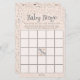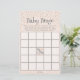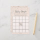 Dit pastel oranje Herfst Baby shower spel heet "Baby Bingo". Het ontwerp: Aan de voorzijde een BINGO-spelkaart met instructies. Kleine kleine sterren en manen aan de bovenkant en een kleine vleermuis in het midden "Gratis" vierkant van de Bingo kaart. Op de achterkant staat een handgetekend patroontje in zwarte inkt met schattige kleine baby-vleermuizen, -sterren, -manen en de handgeschreven zin "Spooky Schattige" allemaal tegen een wervelende pastel oranje achtergrond. Hoe te spelen: Elke gast krijgt een bingokaart. Voordat Mom-to-Be haar geschenken opent, vult elke gast de pleinen in met geschenken waarvan hij / zij denkt dat Mom-to-Be zal ontvangen. Terwijl ze elk geschenk uitpakt, kruisen gasten dat cadeauartikel op hun kaart. De eerste gast die vijf op een rij wint.