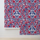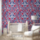 Dit luxe behang heeft een patroon gebaseerd op Ottomaanse china met bloem motieven en marine blauwe en rode kleuren.