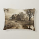 Accentkussen met een toile, stof in sepia tint, oude boerderij op het platteland op een bewolkte dag. Onverharde weg heeft plassen na de regen en grote bomen naast het huis.