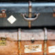 Oude koffers uit de jaren veertig van de vorige eeuw zijn gestapeld op het perron van het spoorwegstation, klaar om door de eigenaars te worden verzameld. Engeland.