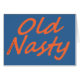 De woorden "Old Nasty" zijn een vleugje op een populair kledingmerk. in oranje letters op een blauwe achtergrond geschreven.