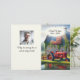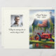 Oude rode boerderijen tractor door een rustieke houten schuur met een Amerikaanse vlag voor een begrafenis of herdenkingsdienst. Alle tekst en persoonlijke foto's kunnen worden gewijzigd.