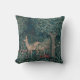 Een oud tapijtkussen met herten in een bos.