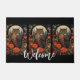 A welcome doormat with a cool looking owl with a piercing stare. A full moon in the back with a garden of red flowers.