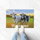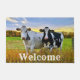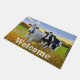 Deze koe-thema welkomstdeurmat zal een grillige groet zijn aan uw gasten wanneer ze shows voor een seizoensgebonden herfstbezoek. Het beschikt over een afbeelding van een paar zwarte en witte Holstein zuivel koeien in een kleurrijke herfstweide met een bewolkte lucht boven.