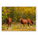 Kastanjepaarden die tegen een gouden herfst bladerachtergrond lopen: een briefkaart voor alle paardenliefhebbers.