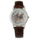 Een leren horloge met een buitenfoto met een team van 2 Belgische trekpaarden die een slee trekken. Sneeuwvlokken vallen zachtjes naar beneden met besneeuwde dennenbomen op de achtergrond. Art deco klok gezicht.
