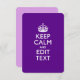 Uw gepersonaliseerde Keep Calm gezegde op een fijn aangepast diepgaand paars accentkleurendecor. Een gepersonaliseerd gezegde van de Stijl van de Kalm van het Levensonderhoud op één van een vriendelijk gift. Een grappige of grillige poging om uw creatieve woorden op twee bewerkbare tekstregels te zetten. Vergeet niet om de KAPITAALletters voor de beste resultaten te gebruiken. Gebruik de link "Vraag deze ontwerper" om contact met ons op te nemen met uw speciale ontwerpverzoeken of voor hulp bij uw aanpassingsbehoeften.