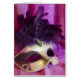 wenskaart met een foto van een paars maskerade masker met veren en glitter.