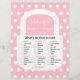 Op zoek naar een paarse vrijgezellenfeest party die niet zoals alle anderen is? Deze is voor jou. Dit paarse vrijgezellenfeest spel is voorzien van een echt paardendesign als spelbord. De tas heeft de woorden "Wat zit er in je tas?" en de deelnemers aan het vrijgezellenfeest kunnen controleren wat er in je tas zit en de totale punten optellen — allemaal in de tas. De witte handtas staat op een roze en witte poka stipachtergrond. U kunt het ontwerp met de naam van de bruid en de datum van het vrijgezellenfeest zelfs aanpassen. Dit is een leuke draai aan het paarse vrijgezellenfeest feest! Auteursrechtenhenishuispapier
