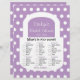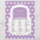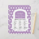 Pak je portemonnee en laten we het paarse vrijgezellenfeest spelen! Deze leuke draai aan het traditionele spel plaatst een handtas in het design met alle details van het spel in de tas. De witte tas heeft de woorden "Wat zit er in je tas?" De partijgasten van de vrijgezellenfeest beantwoorden de vraag wat in uw portemonnee door een vinkje met de punten te plaatsen die zij eigenlijk in hun portemonnee hebben. De portemonnee zit op een lila of paarse achtergrond die een mooie achtergrond maakt voor dit paardenspel. Bovendien kunt u het ontwerp personaliseren met de naam van de bruid en de datum van de douche. Een geweldige paarse vrijgezellenfeest voor je vrijgezellenfeest. Auteursrechtenhenishuispapier