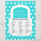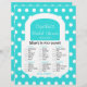 Heb je een wat in je paarse vrijgezellenfeest feest? Nou, dit is een leuke. Het ontwerp is voorzien van een schattige witte tas met een blauwe achtergrond van turquoise waarop witte poka-stippen verschijnen. Het spel in je portemonnee heeft verschillende puntwaarden voor verschillende objecten en dan een plaats voor het totaal aantal punten. Je kunt het spel zelfs personaliseren met de naam van de bruid en de datum. Dit is een leuk spel om iedereen te laten glimlachen op het vrijgezellenfeest. Auteursrechtenhenishuispapier