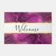 Een welkome vormgeving met een elegant abstract ontwerp. Donkere paarse amethyste kleur met goudlinten tussen gelaagde lagen. Rijk en mooi designGelaagde boven aan is een wit rechthoekig lijst met een faux gouden folie rand, met welkome binnenzijde.