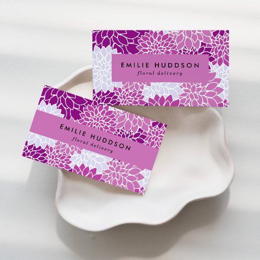 Elegante, stijlvolle en geavanceerde visitekaartjes met paarse Dahlia bloemen. Moderne en trendy design, perfect voor bloemisten, bloemwinkels en bloemenleveringen.