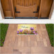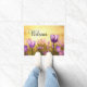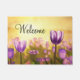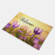 Een gouden zon die over een veld van paarse tulpen stijgt.