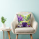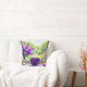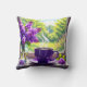 Een kussen met een prachtige illustratie van een levendige paarse lila in een glazen vaas op een vensterbank naast een dampend kopje warme koffie op een heldere zomerdag.