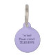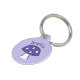 Een paarse paddenstoel met de huisdiernaam op de voorkant boven het pet. Een contactbericht is op de rug.