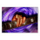 Een digitaal afbeelding van een hand die op een gitaarhals grijpt terwijl hij in een draaiende paarse vortex wordt gezogen als een psychedelisch zwart gat.