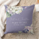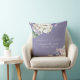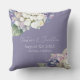 Dit romantische bloemenbruiloft kussen is voorzien van waterverf paarse en witte hortensia's over een stoffige paarse lavendelkleurige achtergrond. Een delicaat boeket van hortensia bloemen is afgebeeld op de bovenkant, en een andere op de onderkant.