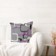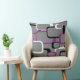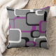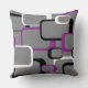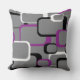 Een leuk ontwerp van retro geïnspireerde vierkanten in paarse, zwart en wit tegen een grijze achtergrond op een werpkussen.
