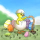 De nieuw uitgekomen kip wenst de regenworm een gelukkig Pasen.