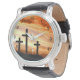 Zonsopkomst, of zonsondergang, op drie kruisen in silhouet ter herdenking van de opstanding van Jezus Christus op Pasen