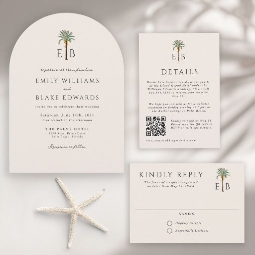 This simple and elegant tropical wedding save the date invitation embodies refined Palm Beach style with a modern, minimalist sensibility. A custom royal palm tree monogram anchors the design, featuring the bride and groom’s initials gracefully placed on either side of the palm for a look that feels both personal and polished. Clean typography and airy spacing with an ivory beige background, the color of a sugar sand beach, creates an upscale aesthetic that blends tropical warmth with contemporary sophistication. Perfect for a coastal or destination celebration, this Save the Date card has a photo template on the back for including an engagement photo or other selected photo of the future bride and groom.