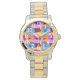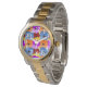 Dit vrouwenhorloge heeft een voorjaarsontwerp van paars, blauw, oranje en rood met gele pansies die op elkaar zijn gelaagd.