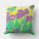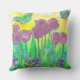 Een kleurrijk bloemkussen met een bloementuin van paarse tulpen, slipjes en felgroene vlinders met een zonneschijngele achtergrond getekend met zwarte pennen en inktinkt met waterverf. Kleurrijk tuinkussen voor de buitenpatio of serre of een leuk cadeau voor een tuinman! Dit ontwerp komt uit mijn kleurboek "Lila's Garden: A Cottage Garden Coloring Book" dat je op Amazon kan vinden.