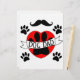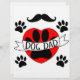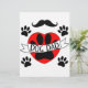 Een hondenpootdruk in een rood hart met tekst op een lint. Origineel ontwerp met poten en een snor. Een cadeauidee voor mannen.
