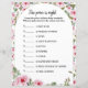 Baby shower spel "De prijs is goed" Raad de prijzen van deze baby essentials. Degene die het dichtst bij de echte waarde komt, wint. Het Baby shower Game-papierblad is voorzien van schattige waterverf-rozen.