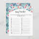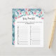 Een vel papier met het spel "Baby Item ABC" voor een baby shower, versierd met schattige waterverf schilderijen van planten met zacht pastel smaragd en blauw blad, takken en zacht roze rozen.