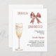 Een moderne, stijlvolle en glamoureuze uitnodiging voor een Parels en Prosecco Vrijgezellenfeest. Een witte achtergrond met een roze strik, glas met bubbels en parels. De naam is geschreven met een modern handgeschreven stijlschrift. Personaliseer en voeg uw partijgegevens toe. 1 vel = 1 uitnodiging bedrukt rand tot rand.
